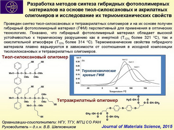 Synthesis and thermomechanical properties of hybrid photopolymer films based on the thiol-siloxane and acrylate oligomers/ V.V. Shelkovnikov , L.V. Ektova, N. A. Orlova, L. N. Ogneva, D. I. Derevyanko, I. K. Shundrina, G. E. Salnikov, L. V. Yanshole// Journal of Materials Science, December 2015, V. 50, N 23, pp 7544-7556 doi:10.1007/s10853-015-9265-9