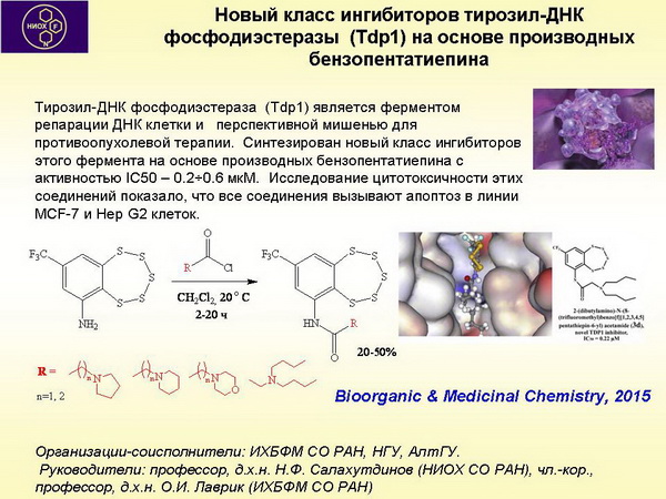 Synthesis and biological evaluation of novel tyrosyl-DNA phosphodiesterase 1 inhibitors with a benzopentathiepine moiety/ A. Zakharenko, T.Khomenko, S. Zhukova, O. Koval, O. Zakharova, R. Anarbaev, N. Lebedeva, D.Korchagina, N. Komarova, V.Vasiliev, J.Reynisson, K. Volcho, N. Salakhutdinov, O. Lavrik// Bioorganic & Medicinal Chemistry, V. 23, N 9, 2015, Pp 2044-2052 doi:10.1016/j.bmc.2015.03.020