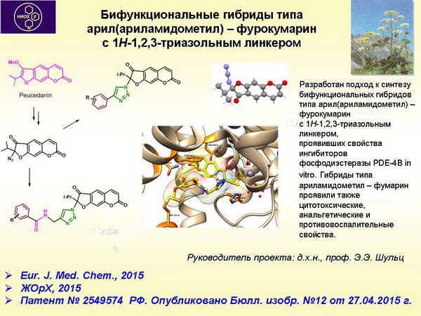 - Исследование растительных кумаринов. XV. фурокумарин ореозелон в синтезе 3-(z)-алкенил- и 3-(1 H-1,2,3-триазол-4-ил)псораленов/ Липеева А.В., Шульц Э.Э.// Журнал органической химии. 2015. Т. 51. № 7. С. 977-985 doi:10.1134/S1070428015070012X.