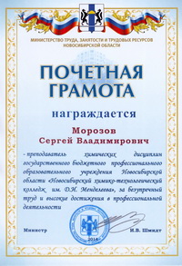к.х.н. Сергея Владимировича Морозова (завлаб ЛЭиХА, преподаватель химических дисциплин Новосибирского химико-технологического колледжа им. Д.И.Менделеева )